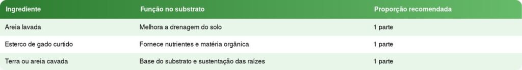 O substrato ideal deve oferecer boa drenagem, nutrientes e estrutura adequada para o crescimento das raízes. Uma mistura bastante utilizada é feita com três componentes principais.