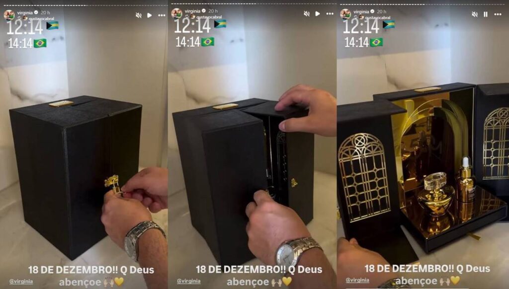 Dentro da caixa, os sortudos encontram alguns elementos de luxo: um espelho marcando o número 50M, alusivo ao número de seguidores de Virginia, e produtos de beleza da linha pessoal da empresária, incluindo um perfume e um sérum. Esse cuidado especial com detalhes reforça a identidade de Virginia como uma influenciadora que alia moda e beleza em todas as suas iniciativas.