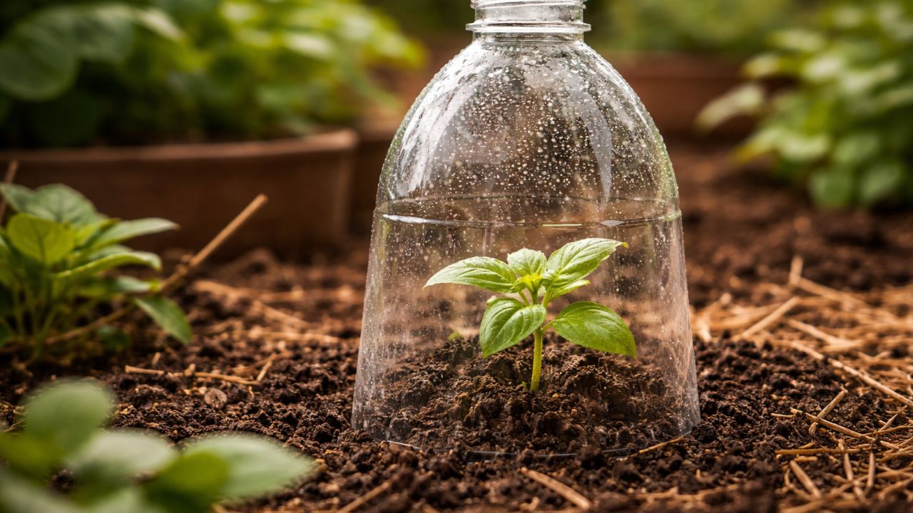 Mudas jovens podem sofrer bastante com vento, frio ou perda rápida de umidade. Uma garrafa PET cortada pode ajudar a criar um pequeno ambiente protegido para o crescimento da planta.