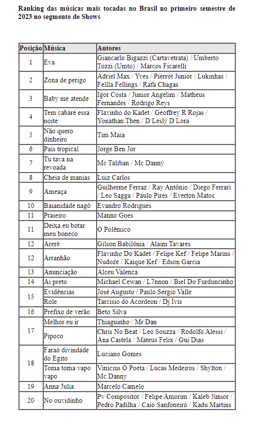 O ranking do segmento de Shows produzido pelo Ecad contou com as músicas mais tocadas no Brasil nos 31 mil shows e eventos licenciados no primeiro semestre de 2023. Fazem parte da lista os eventos em que os organizadores e promotores entraram em contato com a instituição para realizar o cadastro e efetuar o pagamento dos direitos autorais, o que é imprescindível para que os compositores e demais artistas recebem seus rendimentos. Além disso, cabe aos organizadores e promotores o envio do roteiro musical para a identificação das músicas e o posterior repasse dos valores arrecadados aos compositores.