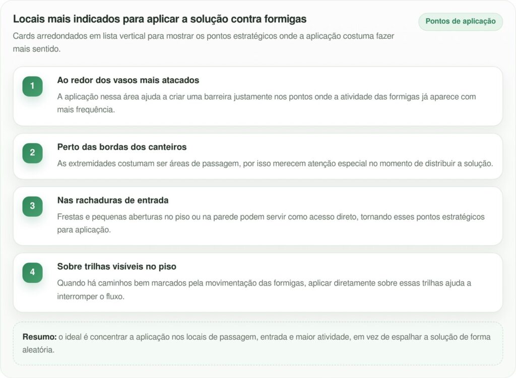 Esse método costuma funcionar melhor quando aplicado nos pontos de maior circulação, não apenas no centro do ninho. Ao atingir os caminhos usados todos os dias, a mistura interfere no fluxo das operárias e dificulta a retomada da invasão no mesmo ritmo.