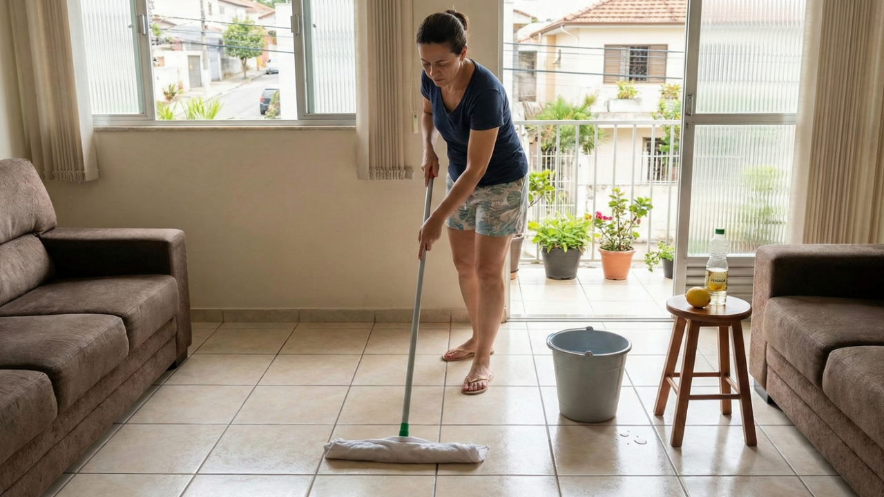 O melhor é escolher um caminho por vez. Para a maioria dos pisos, um balde com água morna e um pouco de vinagre já dá conta. E se você tem piso sensível, como madeira ou laminado, vale usar menos líquido e pano bem torcido, para não encharcar.