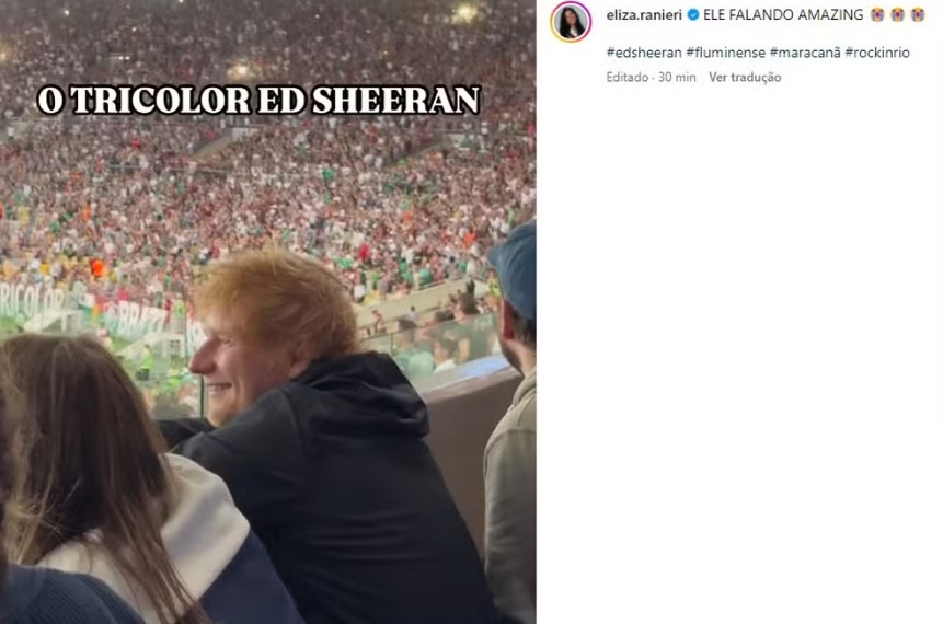O cantor Ed Sheeran surpreendeu os fãs brasileiros ao assistir a partida entre Fluminense e Atlético-MG, na noite desta quarta-feira (18) no Estádio do Maracanã. Conhecido por sua simpatia e conexão com o público, o artista britânico demonstrou entusiasmo com a experiência, compartilhando sua empolgação nas redes sociais: “Amazing!”