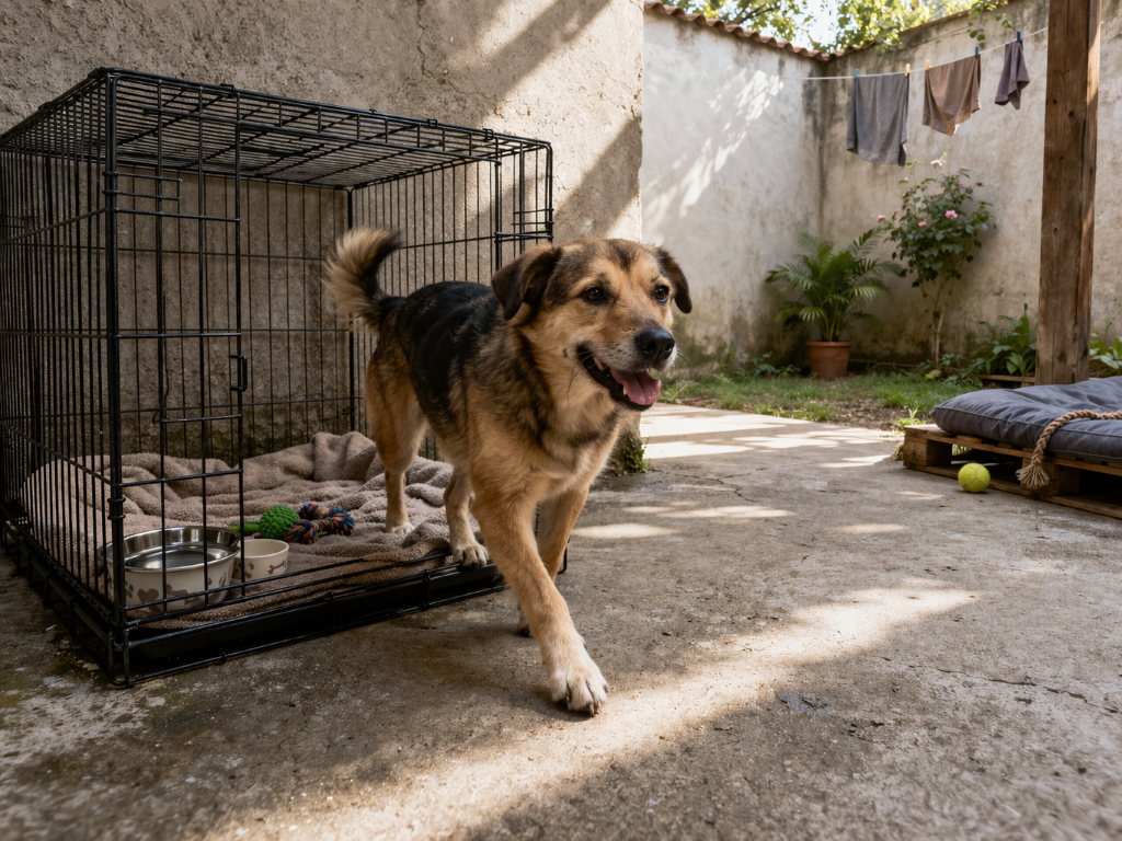 O cão resgatado vivia com medo constante, evitando sair da gaiola mesmo em um ambiente seguro. Esse comportamento é comum em animais que sofreram negligência ou abandono.