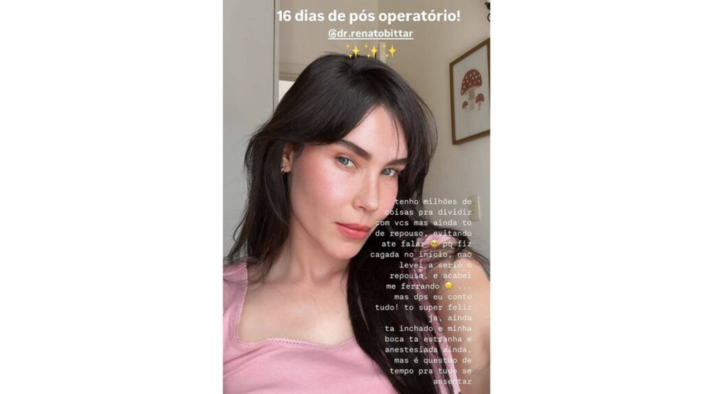 Nesta quarta-feira, 19, Ellen explicou que está em segurança após a cirurgia, realizada há 16 dias. Ela confessou que inicialmente não seguiu as recomendações médicas, o que resultou em complicações. Apesar disso, Ellen se mostrou otimista quanto à recuperação, afirmando que está feliz com o progresso, embora ainda esteja lidando com surto e anestesia na boca.