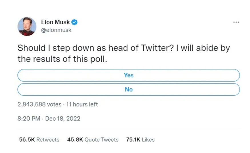 Elon Musk fez uma pesquisa perguntando aos usuários do Twitter se ele deveria deixar o cargo de chefe da rede social. A resposta foi a de se imaginar: 57% disseram sim.