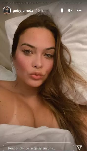 Geisy Arruda encantou seus seguidores, nos Stories do Instagram, na noite desta segunda-feira (14). A musa compartilhou um clique em que aparece sem sutiã deitada na cama de hotel e ostentou seu corpão.