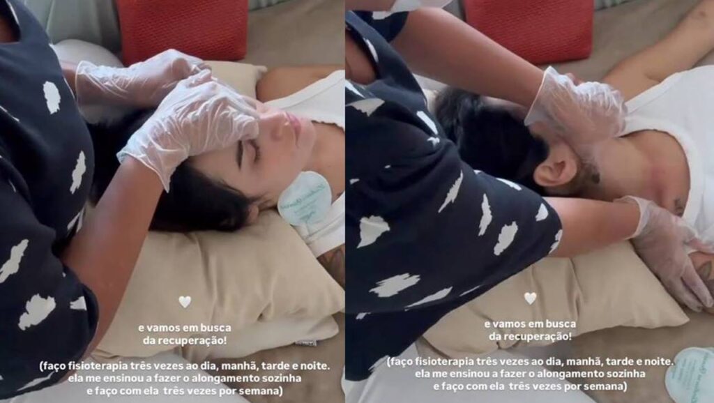 Gabi Melim publicou nas redes sociais nesta quarta-feira, 4, que está fazendo fisioterapia três vezes ao dia, no vídeo a fisioterapeuta aparece realizando uma espécie de massagem em seu rosto. “E vamos em busca da recuperação! Fisioterapia três vezes ao dia (manhã, tarde e noite). Ela me ensinou a fazer alongamento sozinha e faço com ela três vezes por semana”, Escreveu ela no video publicado via stories do Instagram,