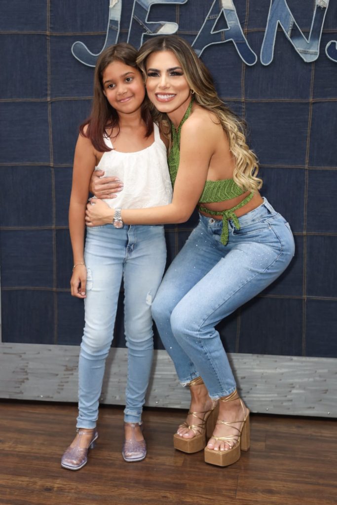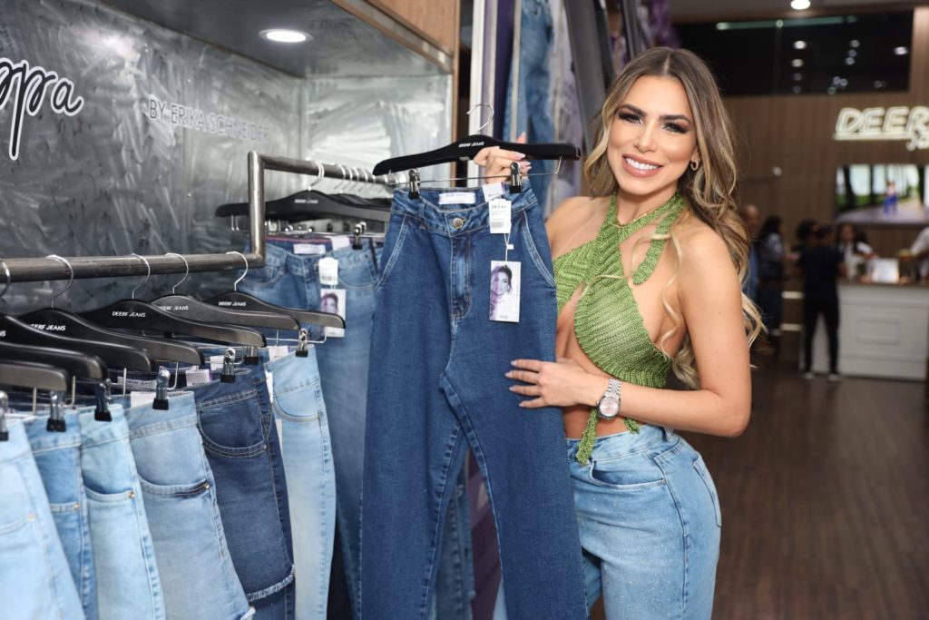 Erika Schneider usa look justinho em lançamento de sua coleção de jeans