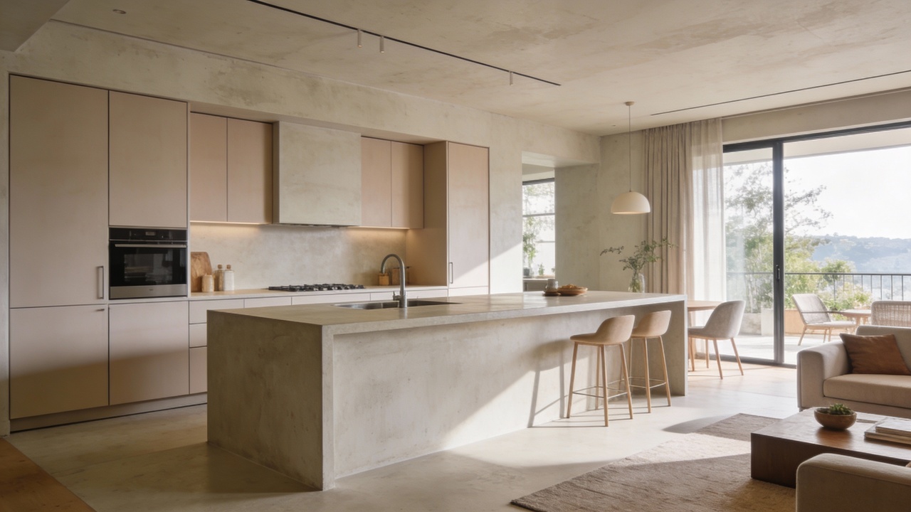 Cresce a busca por revestimentos que parecem nascer da arquitetura, e não apenas aplicados como acabamento. Microcimento, estucos minerais e pinturas em cal criam continuidade entre paredes, bancadas, nichos e alguns móveis fixos, dando a sensação de bloco único.