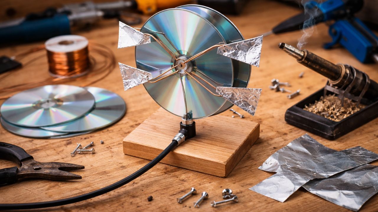 A montagem de uma antena de TV caseira com CDs segue uma lógica simples, usando componentes comuns em casa. A ideia é combinar peças metálicas condutoras com uma base firme e um cabo adequado, garantindo contatos bem feitos e evitando perdas de sinal por mau encaixe ou oxidação precoce.