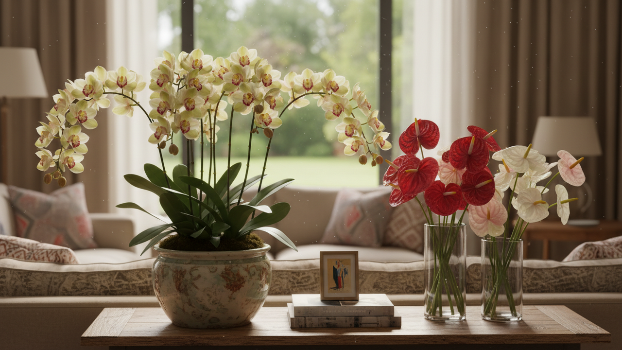 Ao buscar flores ideais para quem quer decorar sem precisar trocar sempre, muitas pessoas combinam Cymbidium e Anthurium no mesmo ambiente, explorando formatos e alturas diferentes. Enquanto a orquídea oferece hastes altas e flores delicadas, o antúrio traz brácteas brilhantes e folhas largas, criando contraste visual interessante em salas, recepções e áreas sociais.