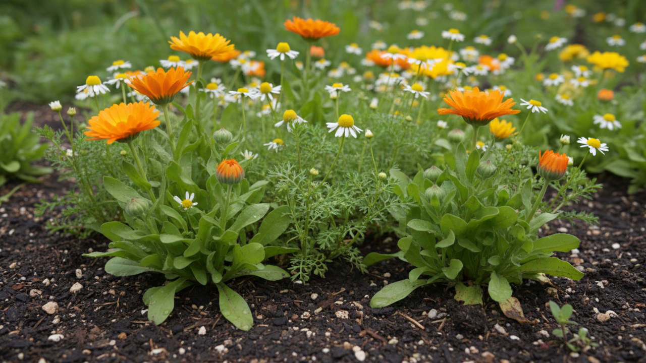 No caso da camomila, seu aroma suave para humanos é intenso para muitos insetos, funcionando como um leve repelente natural e contribuindo para o vigor das vizinhas. Já a calêndula é conhecida por atrair insetos benéficos, como joaninhas, e por desviar pragas de culturas sensíveis, servindo como “planta isca” e ajudando ainda a reduzir a presença de alguns nematoides no solo.