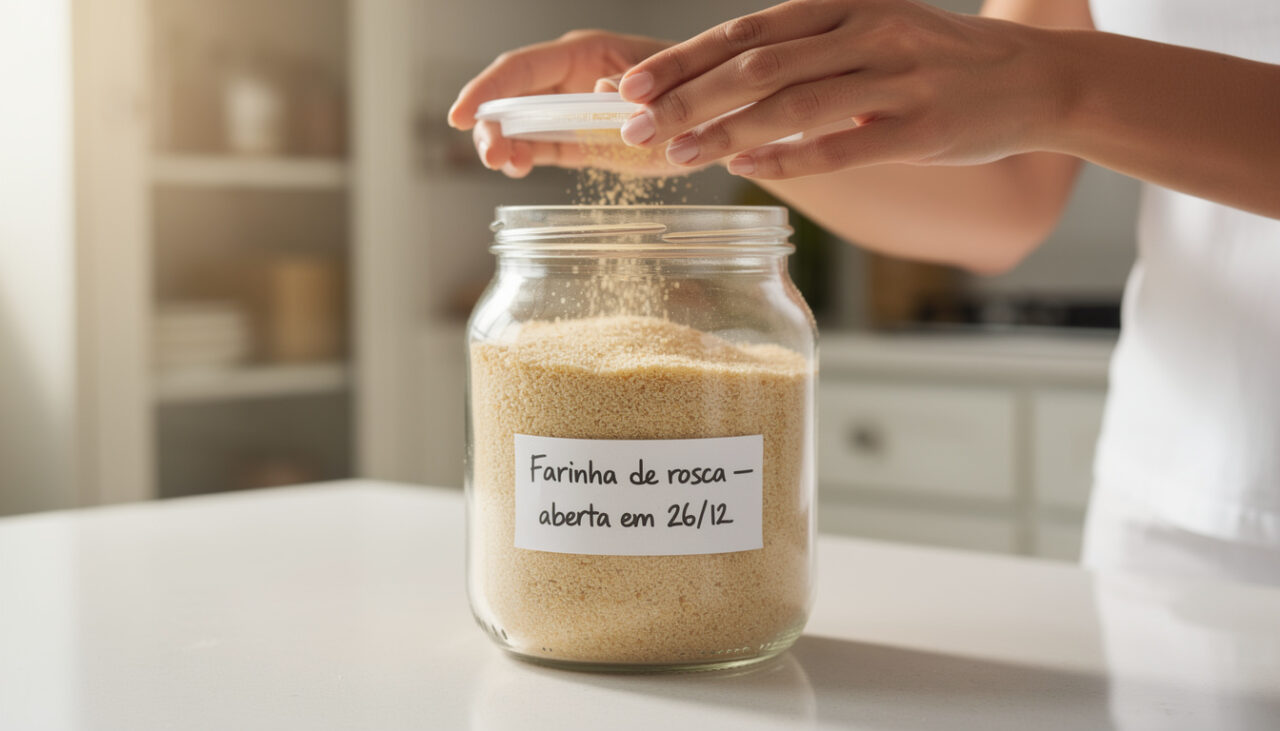 Para conservar farinha de rosca em casa, o ideal é armazená-la em local fresco, seco e protegido da luz direta. Um armário fechado, longe do fogão e de outras fontes de calor, ajuda a evitar variações de temperatura que favorecem a umidade e aceleram o aparecimento de bolor.