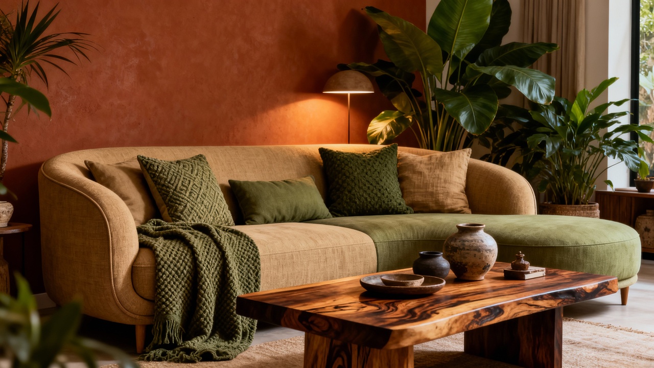 Tons terrosos profundos, como açafrão e terracota intensa, misturam-se a amarelos, laranjas e azuis escuros, em camadas de almofadas, tapetes e pufes que reforçam identidade cultural e sustentabilidade.