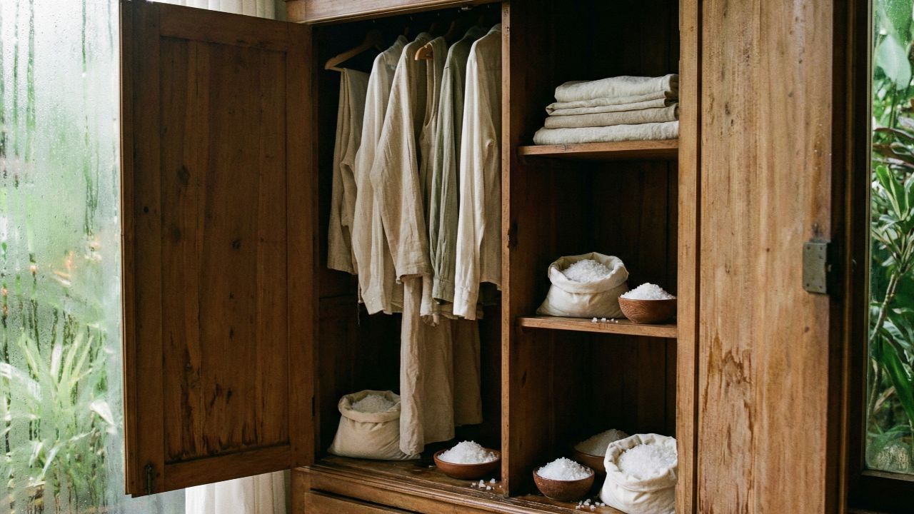 Eu nunca mais comprei desumidificador caro após usar sal grosso no guarda-roupa