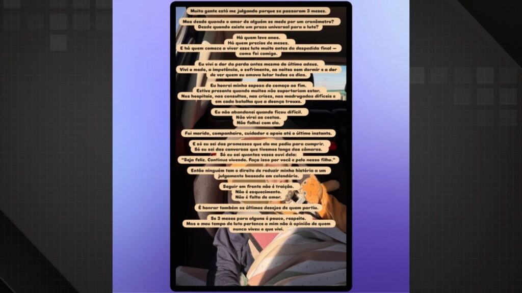 Para encerrar, ele pontuou que ninguém deveria avaliar sua trajetória pessoal com base em datas. “Ninguém tem o direito de reduzir minha história a um julgamento baseado em calendário”, declarou o viúvo, contestando a validade das cobranças sobre seu tempo de recuperação.