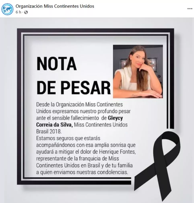 Nas redes sociais, a organização do Miss Brasil Continentes Unidos postou uma homenagem para a modelo