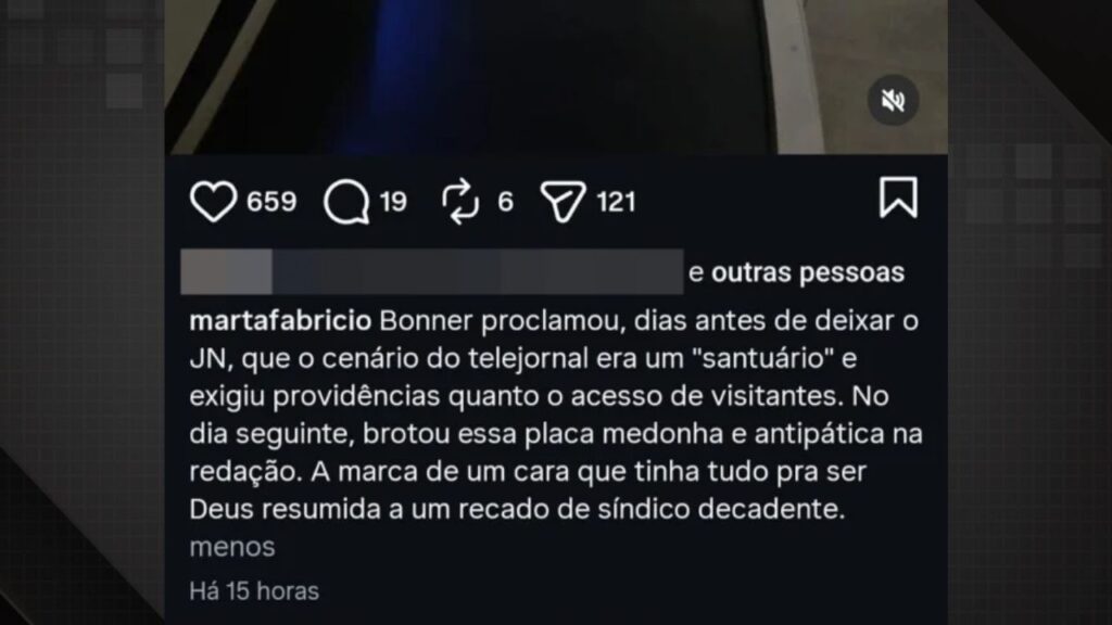 Entre os episódios relatados, descreveu uma situação que testemunhou envolvendo Bonner na redação. Segundo ele, o que ficou no ar foi a decepção com a postura do jornalista diante de uma circunstância que não detalhou por completo. “No dia seguinte, brotou essa placa medonha e antipática na redação. A marca de um cara que tinha tudo pra ser Deus resumida a um recado de síndico decadente”, escreveu.