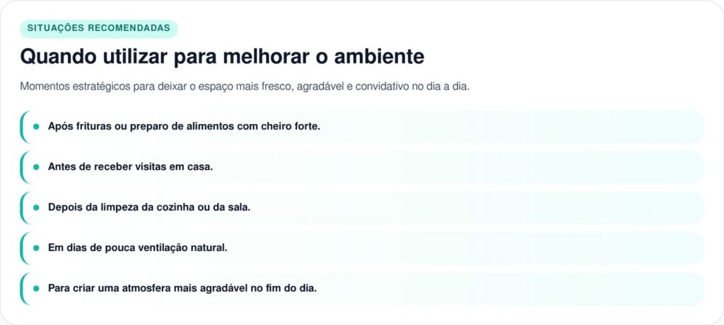 Essa combinação costuma funcionar muito bem quando a casa precisa de um reforço rápido de frescor. O uso faz sentido em situações em que o ambiente pede mais conforto, aroma limpo e sensação de organização.
