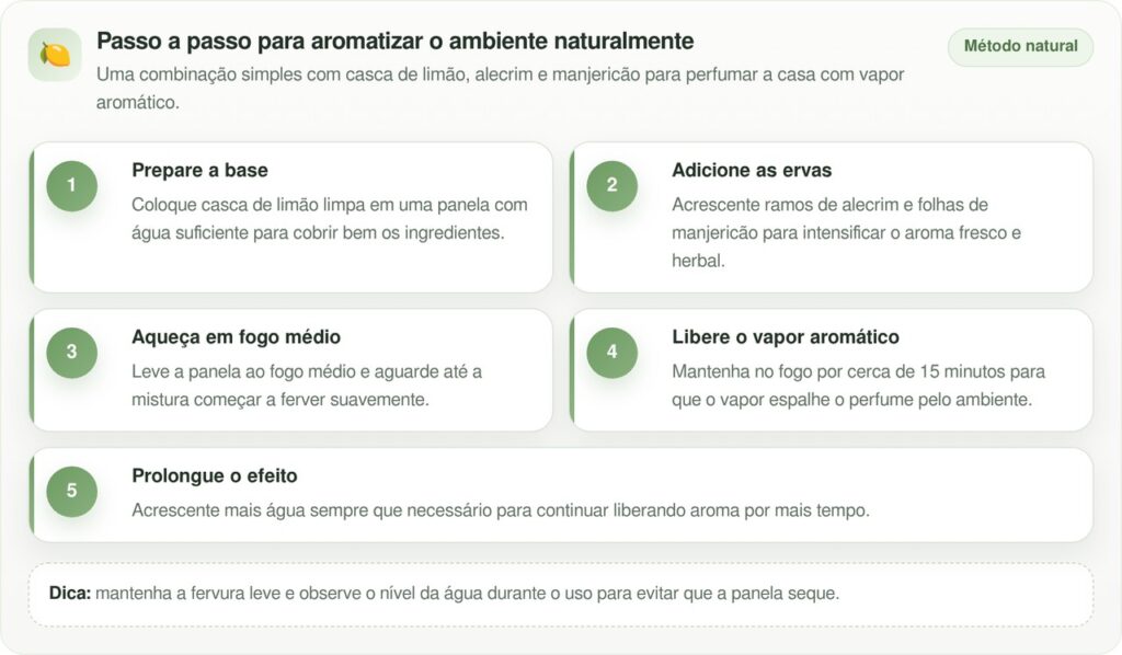 Ferver alecrim, manjericão e casca de limão é recomendado porque une praticidade, economia e cuidado com a casa. Além de aproveitar ingredientes simples, a mistura fortalece uma rotina doméstica mais natural, sustentável e funcional, deixando os ambientes com aroma fresco, percepção de limpeza e mais bem-estar no dia a dia.