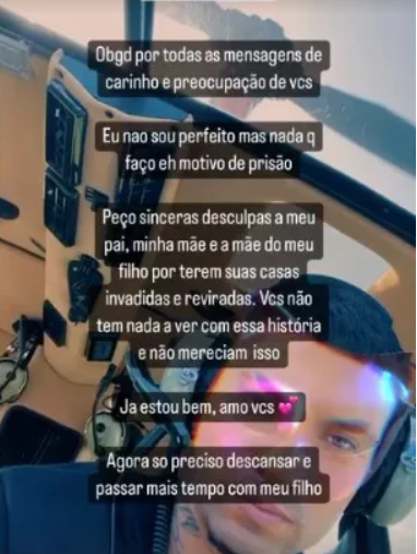Nas redes sociais, ele agradeceu apoio dos fãs e pediu desculpa aos pais pela presença dos policiais na casa onde eles moram, no Flamengo.