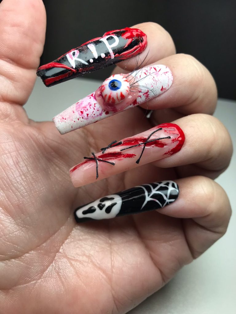 “Entre as principais tendências das unhas decoradas deste ano para o Halloween, é o machucado realista e olhos com cílios. Ambas são 3D, bizarras e assustadoras. A máscara do pânico também vem dando o estilo aterrorizante para a ocasião de terror e bizarrices”, disse a especialista.