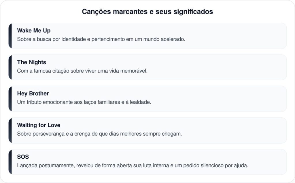 Ao longo da carreira, Avicii construiu um repertório repleto de músicas que tocam em temas profundos como esperança, superação, passagem do tempo e busca por sentido. Seus álbuns “True” (2013) e “Stories” (2015) são considerados marcos da música eletrônica moderna, com letras que vão muito além da pista de dança. Algumas das canções mais emblemáticas incluem:
