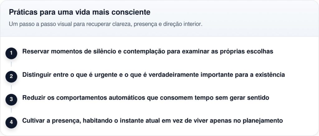 A filosofia não exige que vivamos em urgência permanente ou que transformemos cada minuto em produtividade. Sêneca propõe algo mais sutil e mais profundo, que usemos o tempo com intenção. Algumas práticas alinhadas a esse pensamento filosófico são: