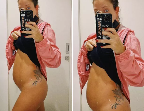 No clique, a influencer está quatro meses de gestação, só de blusa, em frente ao espelho.