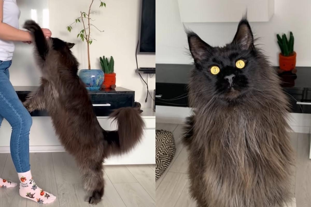Adotado em 2021 por Daniela Ermolaeva, da Moldávia, Zeus rapidamente chamou atenção, mesmo entre os exemplares já grandes de sua raça. Com pelos longos, cauda volumosa e presença marcante, o gato protagoniza o perfil @zeus.mainecoon.official, que acumula milhões de visualizações. Em algumas publicações, ele chega a assustar pelo tamanho ao ficar em pé, alcançando quase a altura de sua tutora, que mede 1,60 metro.