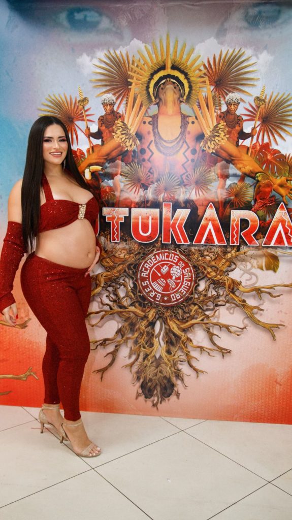 No auge da gravidez, Nathalia Hino, rainha de bateria da Estácio de Sá, tem cumprido rigorosamente sua agenda de compromissos com a Agremiação. Prova disso foi sua ida até à quadra da escola de samba Salgueiro, no Andaraí, Zona Norte do Rio, no último sábado (19).