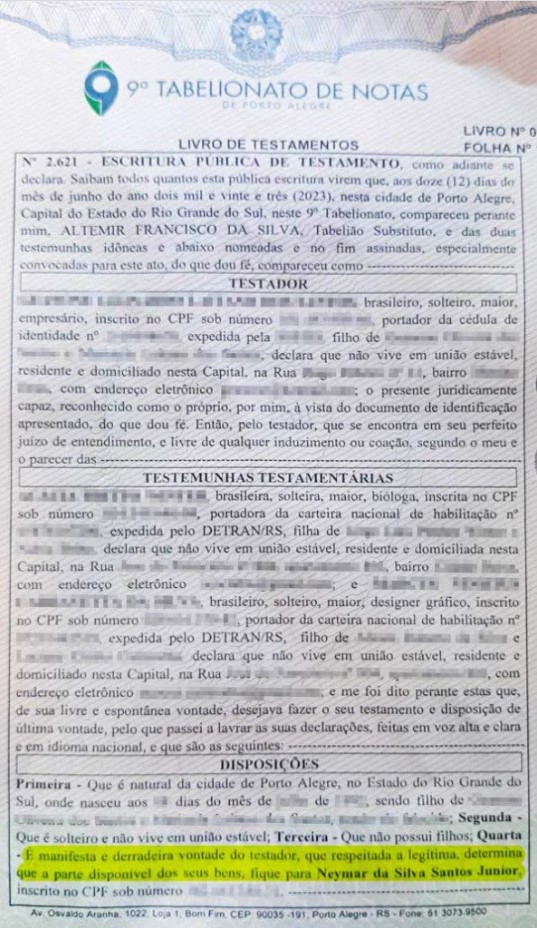 Um homem de 30 anos, morador de Porto Alegre, no Rio Grande do Sul, resolveu deixar todos os seus bens para Neymar Jr, jogador do PSG e da seleção brasileira. Atitude foi oficializada no testamento feito pelo rapaz, no último dia 12 de junho.