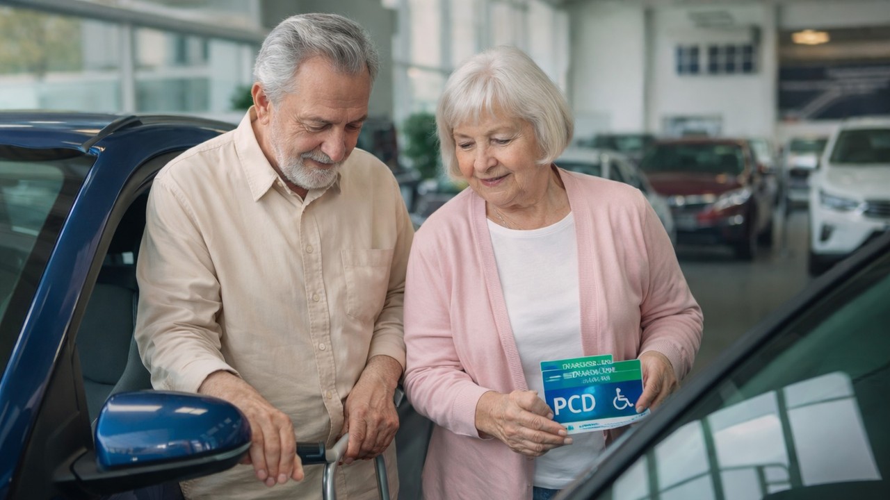 Casal de idosos em concessionária, a mulher segura um folheto 'PCD' com símbolo de cadeira de rodas.