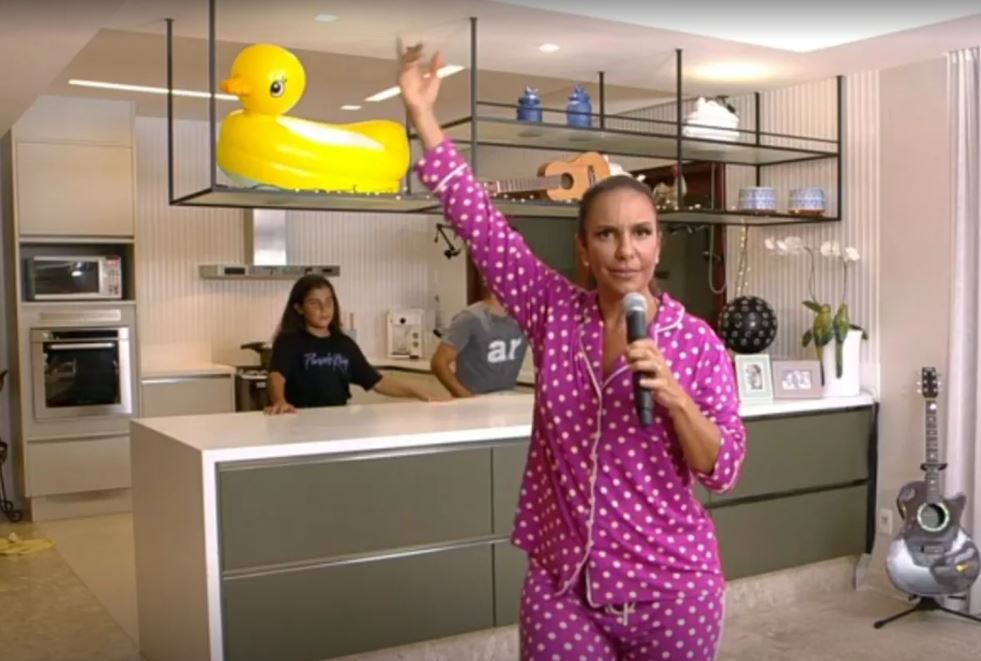 Ivete não fez tudo sozinha no “palco” da sua cozinha, não. Com a ajuda do marido, Daniel Cady, e Marcelo, seu filho mais velho, ela botou para quebrar ao cantar uma sequência de sucessos, como “Acelera aê”, “Festa” e “Poeira”. Entre uma música e outra, a baiana recebeu prontamente um copo de água do maridão. Sempre de bom humor, Veveta contou sobre a escolha do figurino e do cabelo para transmitir a live: