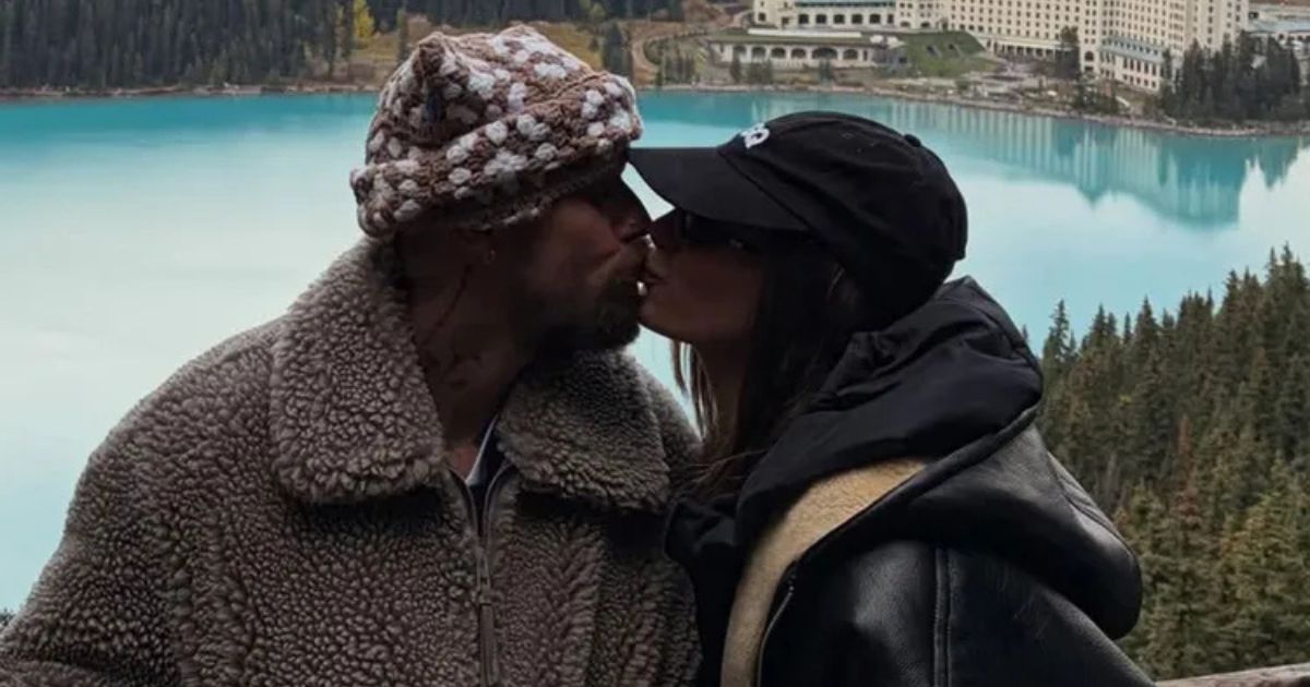 Segundo a People, Justin Bieber foi visto beijando a esposa, com montanhas e um lago azul cristalino ao fundo, enquanto estavam agasalhados com casacos e chapéus.