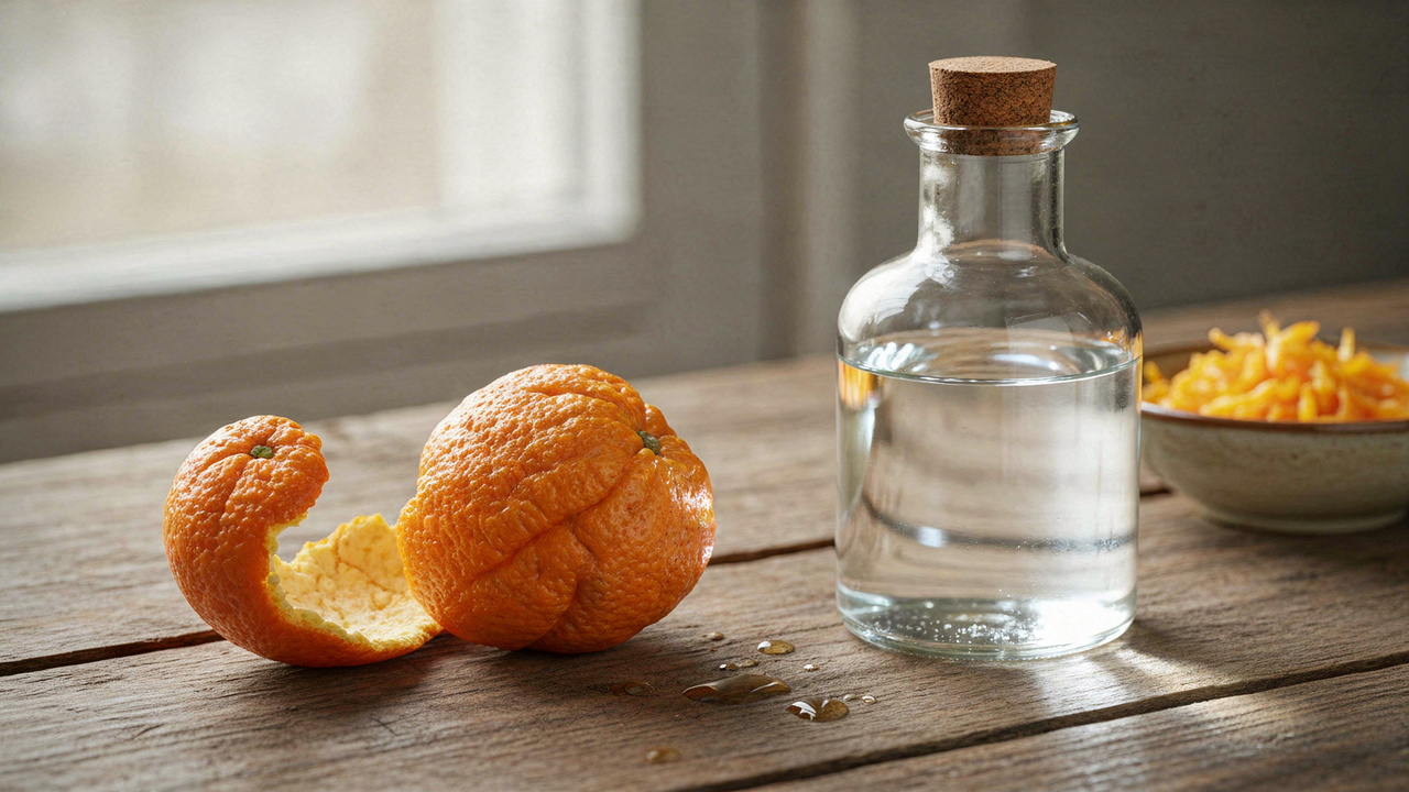 Ao longo de alguns dias, o vinagre extrai óleos essenciais e compostos aromáticos da casca, originando um líquido com cheiro intenso e potencial de limpeza, geralmente usado diluído em água no dia a dia.