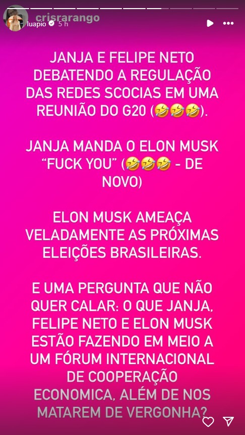 “Janja e Felipe Neto debatendo regulação das redes sociais em uma reunião do G20”, disse rindo. “Janja manda Elon Musk ‘fuck you’. Elon Musk ameaça veladamente as próximas eleições brasileiras”, complementou a atriz.