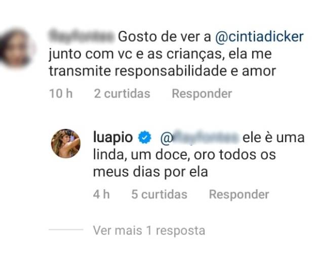 Já uma outra seguidora elogiou pelo fato de Cintia estar no passeio em família. “Ela é uma linda, um doce, oro todos oos meus dias por ela”, declarou Piovani.