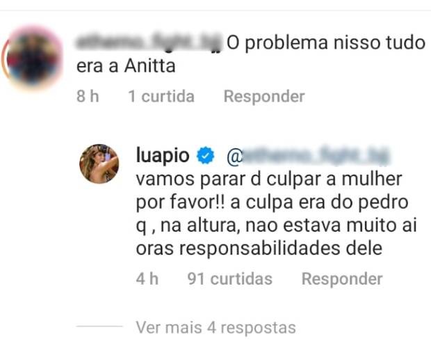 “O problema nisso tudo era a Anitta”, alfinetou o seguidor. “Vamos parar de culpar a mulher, por favor! A culpa era do Pedro, que, na altura, não estava muito aí para as responsabilidades dele”, rebateu a atriz.