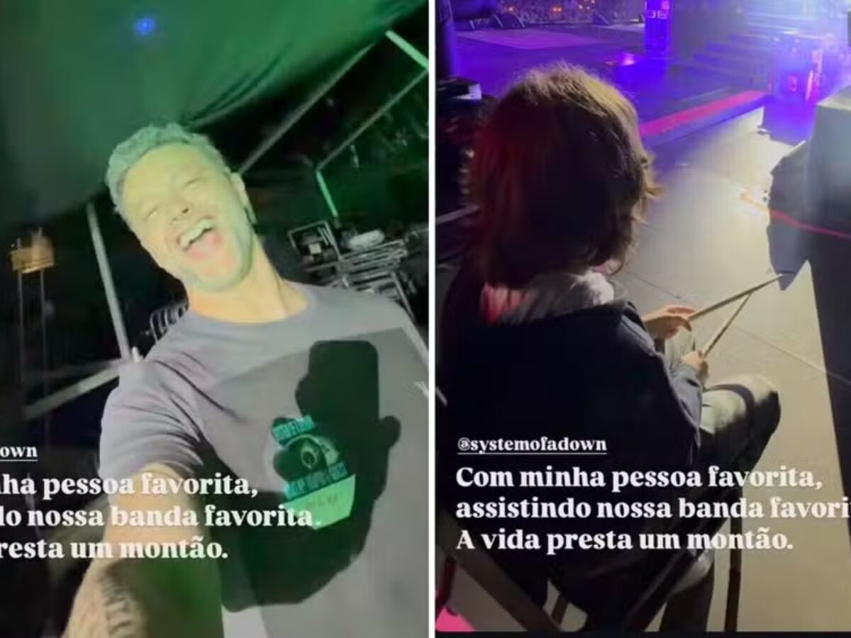 Lucas Lima viveu um momento inesquecível ao lado do filho, Theo, de 10 anos, durante o show do System Of A Down em São Paulo. O músico acompanhou o herdeiro, fruto de seu relacionamento com Sandy, em uma noite marcada por muito rock e cumplicidade. “Com a minha pessoa favorita, assistindo nossa banda favorita. A vida presta um montão”, escreveu Lucas nos stories, demonstrando toda sua empolgação com o evento.