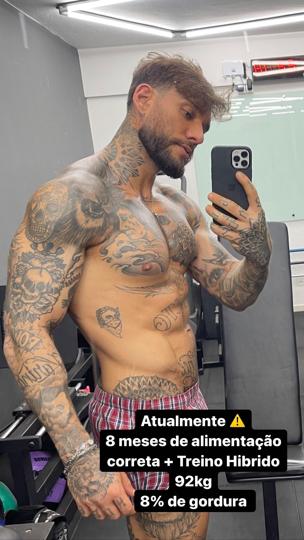 “Eu sei o que é ficar desanimado. Após ter ficado quase quatro meses sem treino, o resultado foi esse da esquerda. Ganhei bastante gordura e perdi massa muscular. A fórmula pra perder a definição e os famosos gominhos. Isso me desanimou demais pra voltar com os treinos. Meus maiores inimigos foram eu mesmo e o espelho. Eu não tinha forças pra dar o primeiro passo, olhava pra mim e já sentia a maior preguiça de voltar a treinar. Muito insatisfeito!”, contou ele.