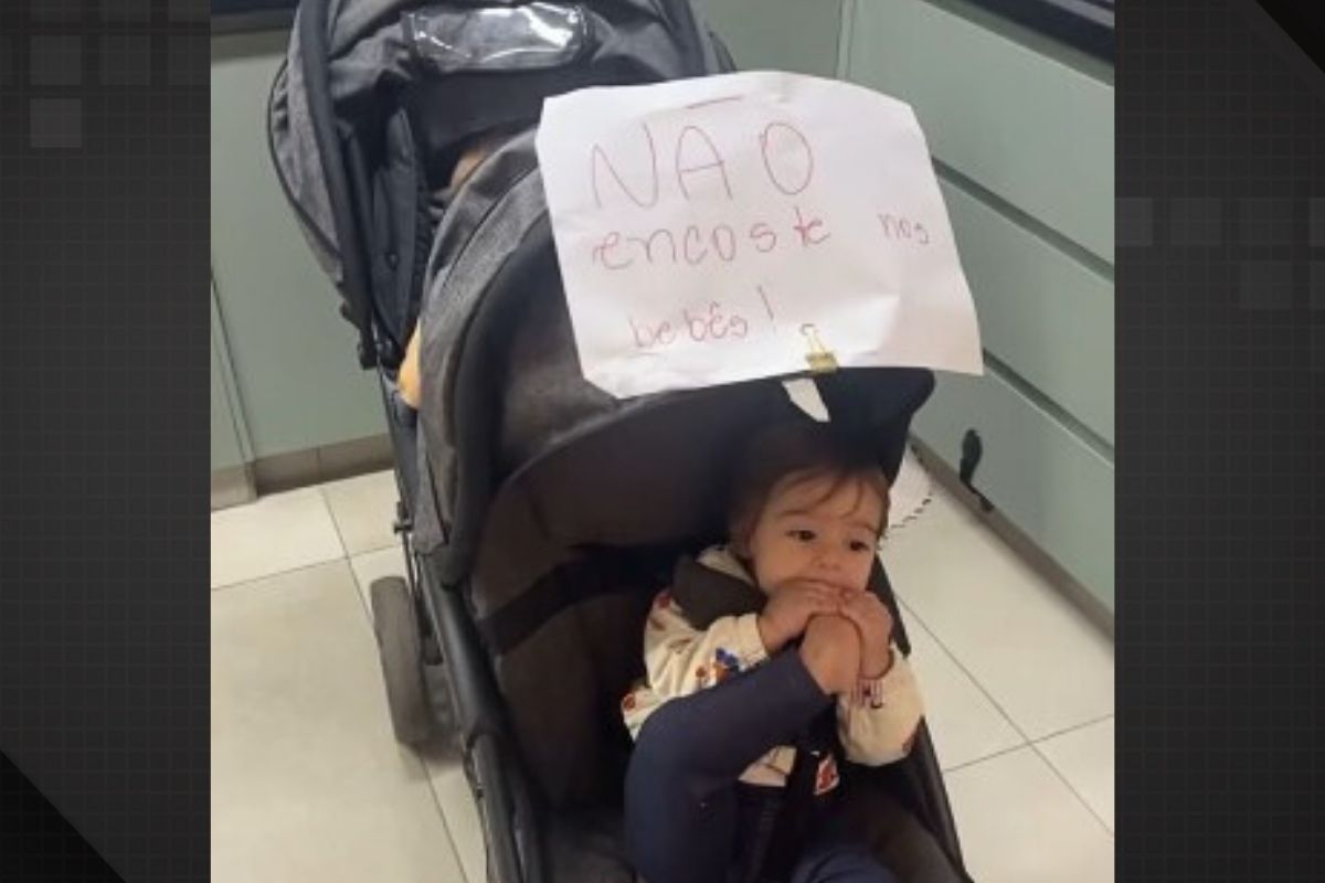 Mãe coloca placa em carrinho e vídeo viraliza nas redes: “Não encoste nos bebês”