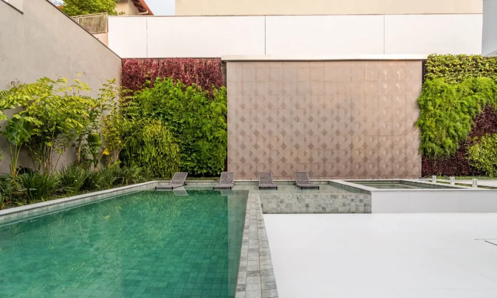 A propriedade não economiza quando o assunto é lazer. A piscina de borda infinita se conecta diretamente ao cinema da casa, criando um espaço de entretenimento único e integrado. O projeto luminotécnico exclusivo e o paisagismo de alto padrão complementam a magnificência do local.