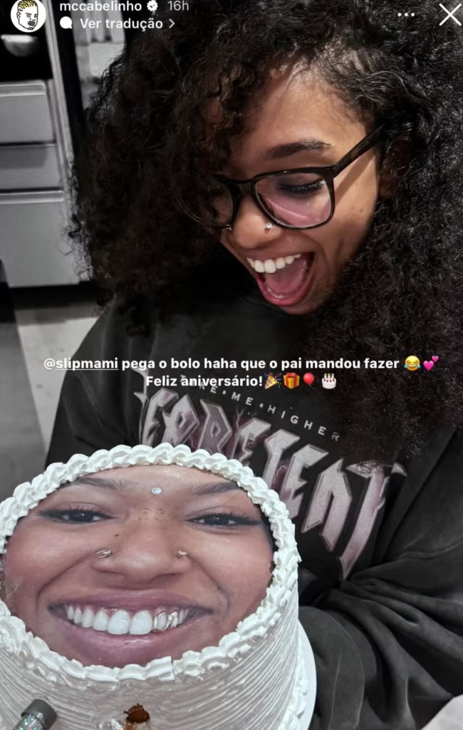 Inspirado no bolo com o rosto de Kanye West, MC Cabelinho presenteia Slipmami com foto dela em bolo de aniversário. “Slipmami, pega o bolo hahaha que o pai mandou fazer. Feliz aniversário!”, escreveu Cabelinho, acompanhado de emojis de comemoração e corações para demonstrar seu carinho pela amada, que completou 24 anos.