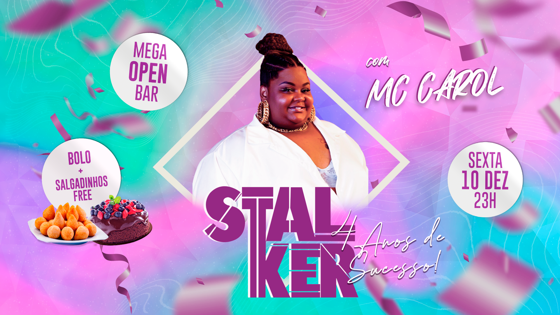 Para comemorar a data em grande estilo, Mc Carol é a atração da noite e o público pode esperar um show que vai ficar na história da Festa Stalker. O line up ainda conta com mais 4 DJs de funk, 3 Djs de Pop e 4 Djs de Tribal. E como uma boa festa de aniversário, será servido bolo e salgadinhos durante o evento.