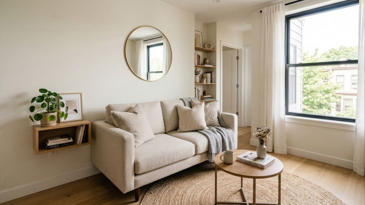Além da cor correta do sofá, o uso estratégico de espelhos é um dos recursos mais eficientes para aumentar a sensação de espaço. Quando posicionados diante de janelas e pontos de luz, refletem claridade e profundidade, fazendo a sala parecer maior.