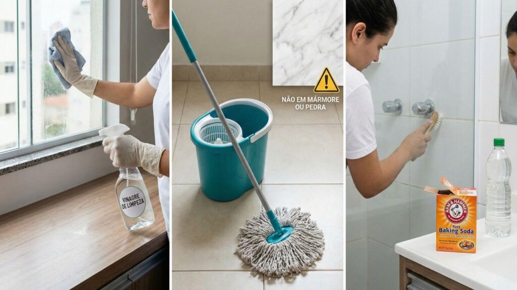 Diluído em água, o vinagre de limpeza é útil para vidros, bancadas e pisos frios, desde que não sejam de mármore ou pedra natural, pois o ácido pode danificar o acabamento e provocar manchas permanentes nessas superfícies sensíveis.