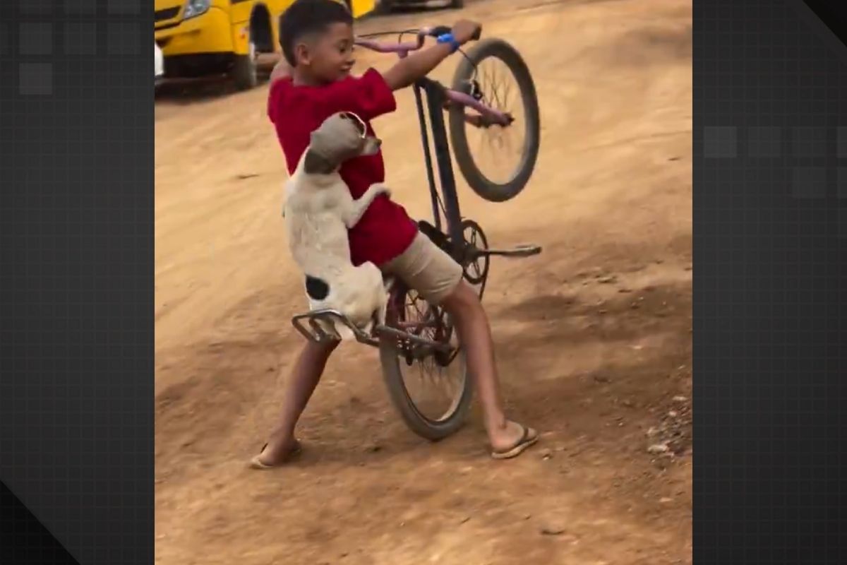 Menino de 9 anos viraliza ao dar “grau” com cachorrinha na garupa de bike