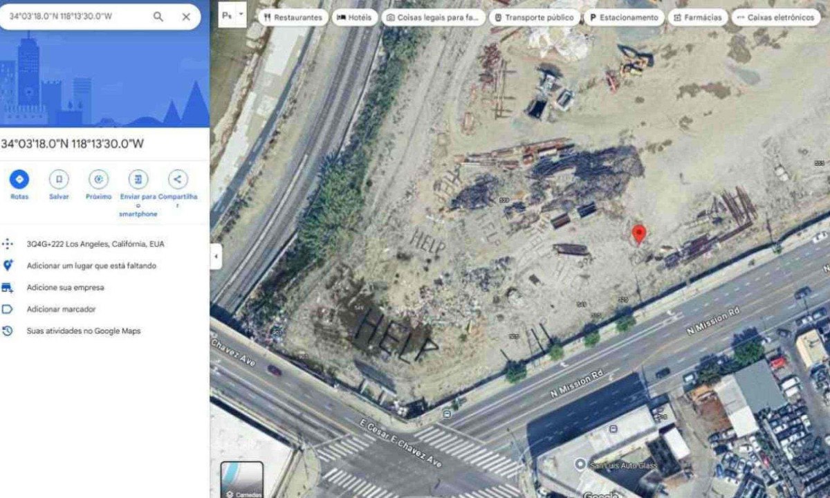 As redes sociais se juntaram para tentar resolver um mistério após encontrarem pedidos de socorros em imagens do Google Maps em um terreno baldio na cidade de Los Angeles, nos Estados Unidos. Na vista aérea é possível ver palavras como “Help” (ajuda, em português), “Traffic” (tráfico, em português), FBI (agência de investigação americana) e “Terrorismo” escrita por objetos que parecerem ser pedaços de madeira ou ferro.